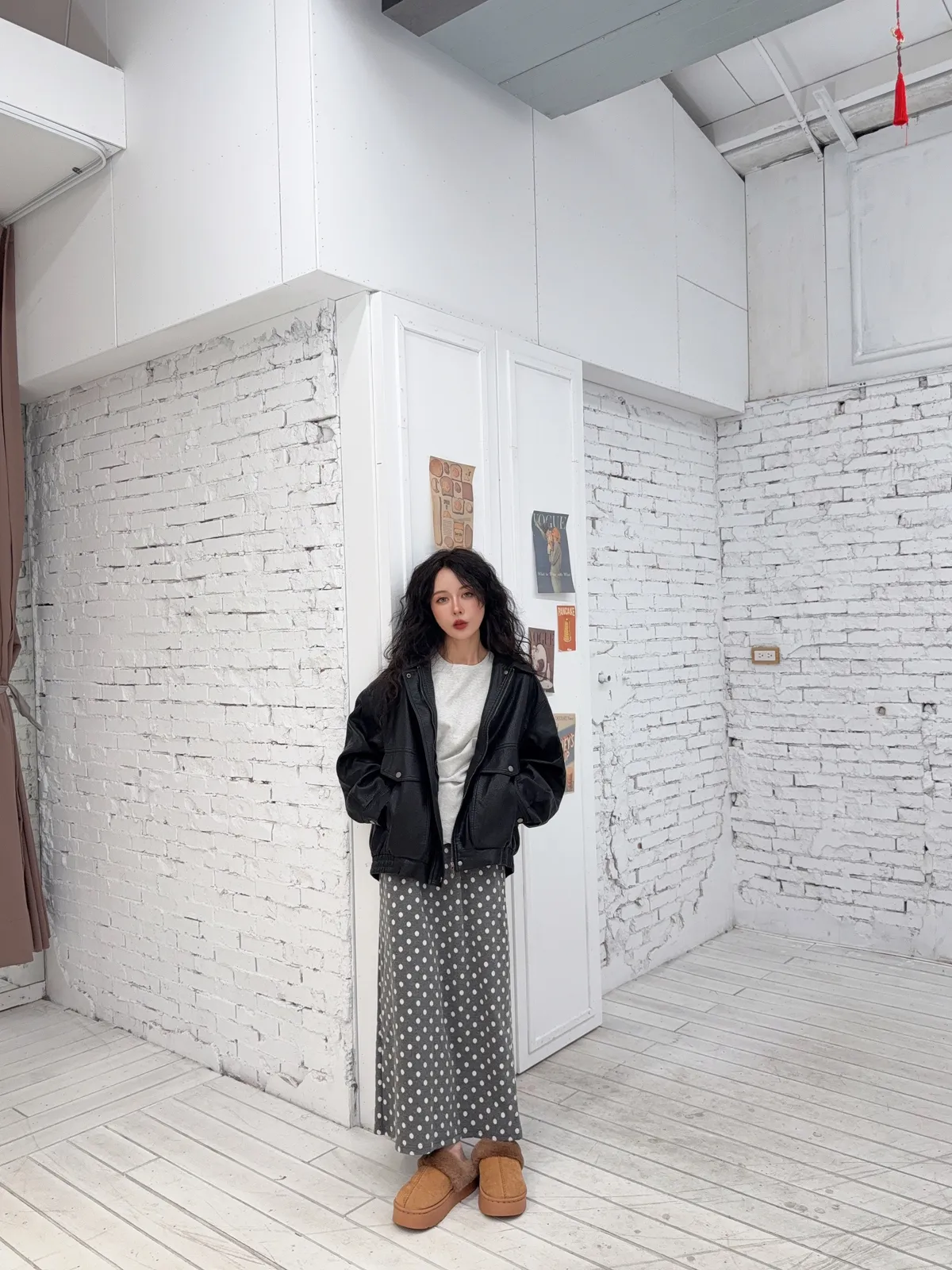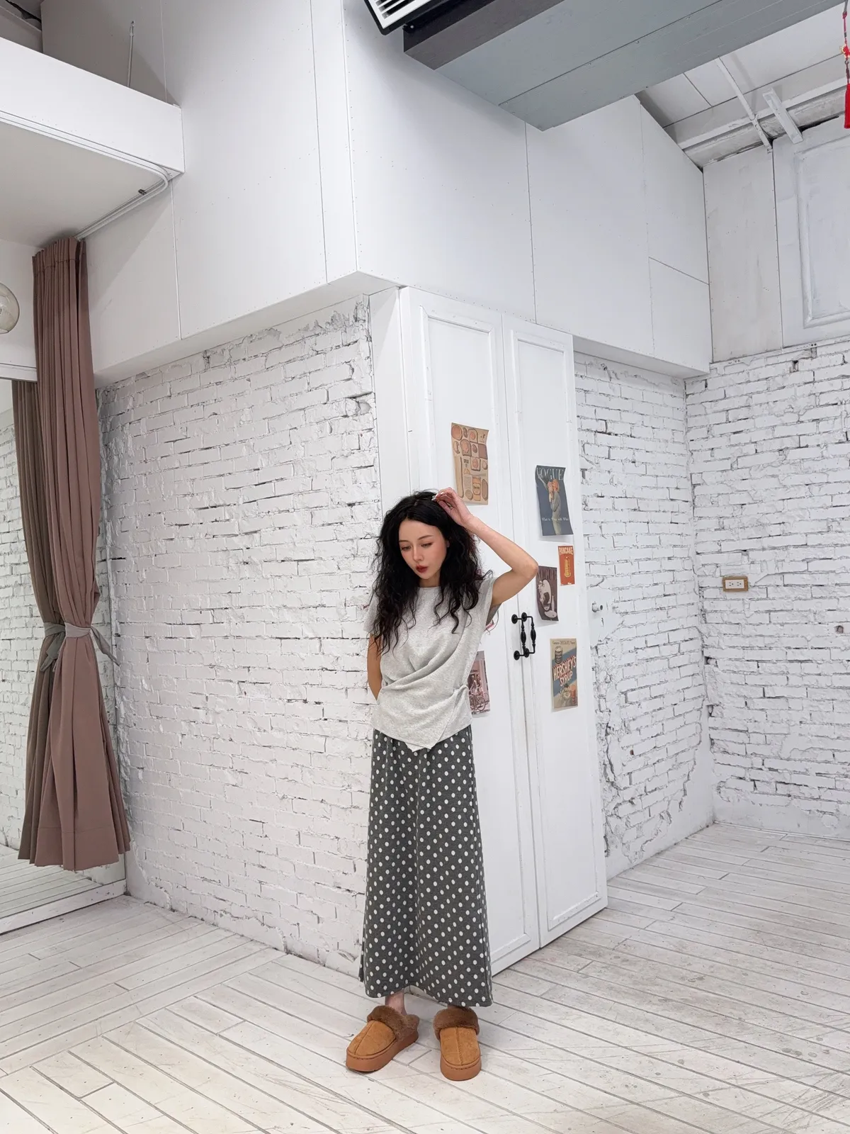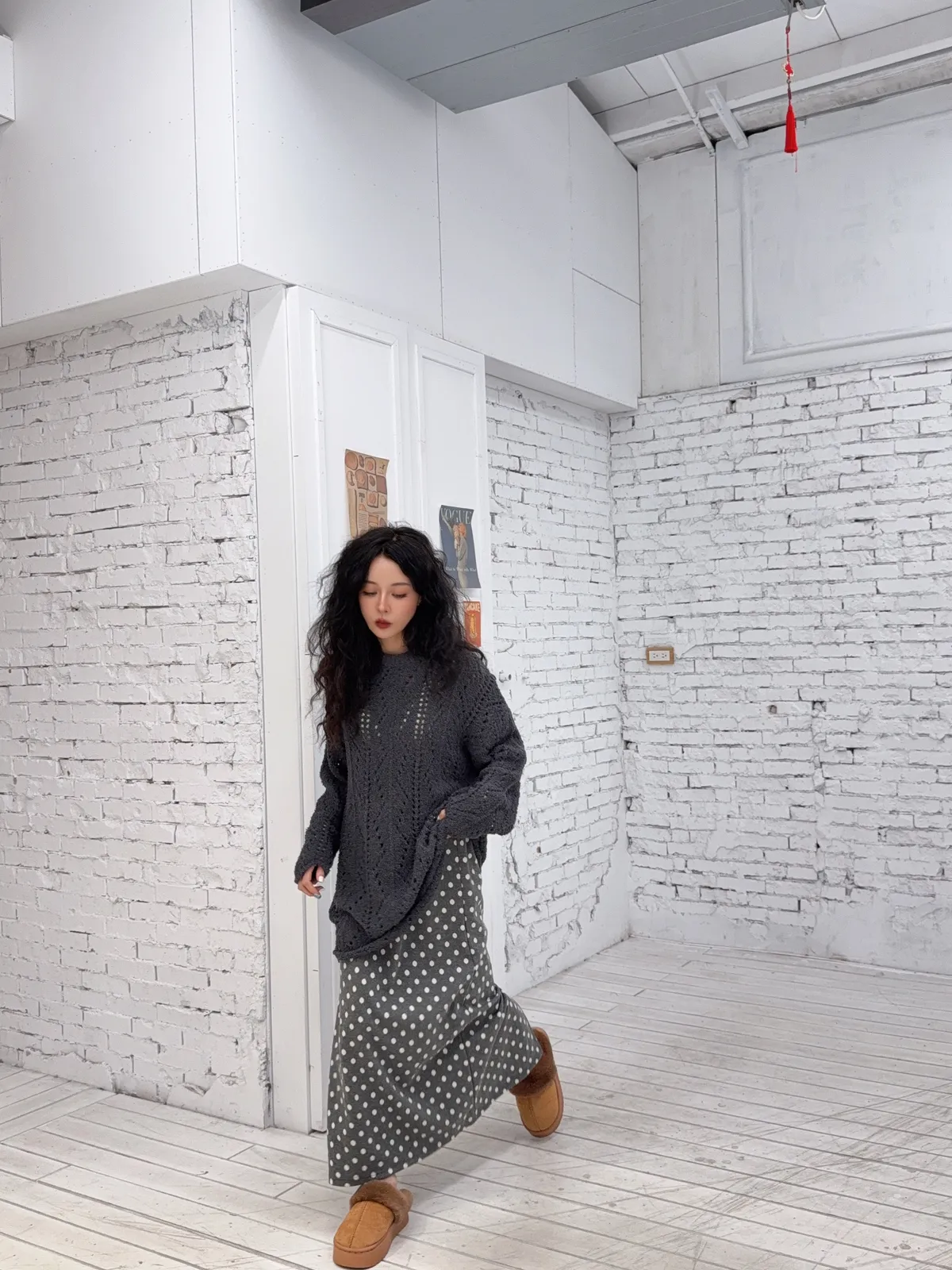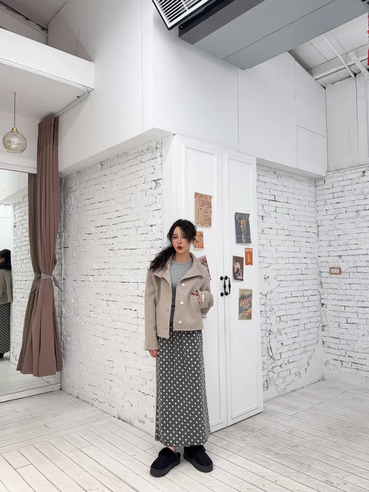 棉80% 聚酯纖維15% 彈性纖維5%毛料點點長裙 超讚的是面料本人有彈性不會真的穿上後動彈不得 是鉛筆裙的進化版 可以伸縮自如的鉛筆(笑)背後有開衩 所以走路起來更是便利這件毛料不是過度厚的材質 不會硬梆梆唷整件都是彈性裙頭如果你是棉花糖會怕毛料彈性你不一定可以進去可以等回台灣郭郭的直播 因為我現在也還沒看他穿過 我也沒把握