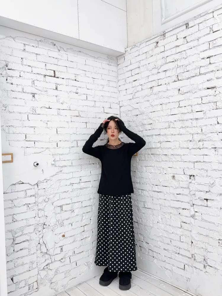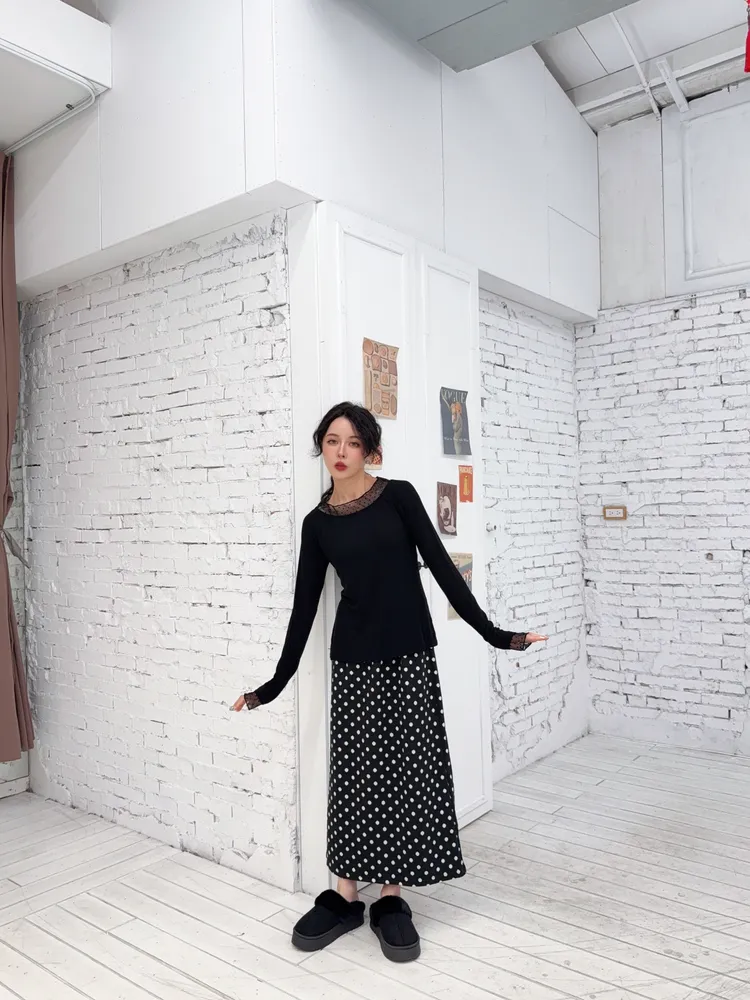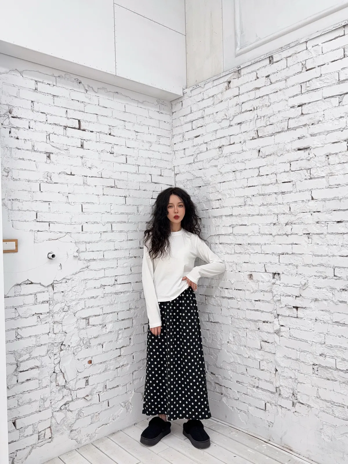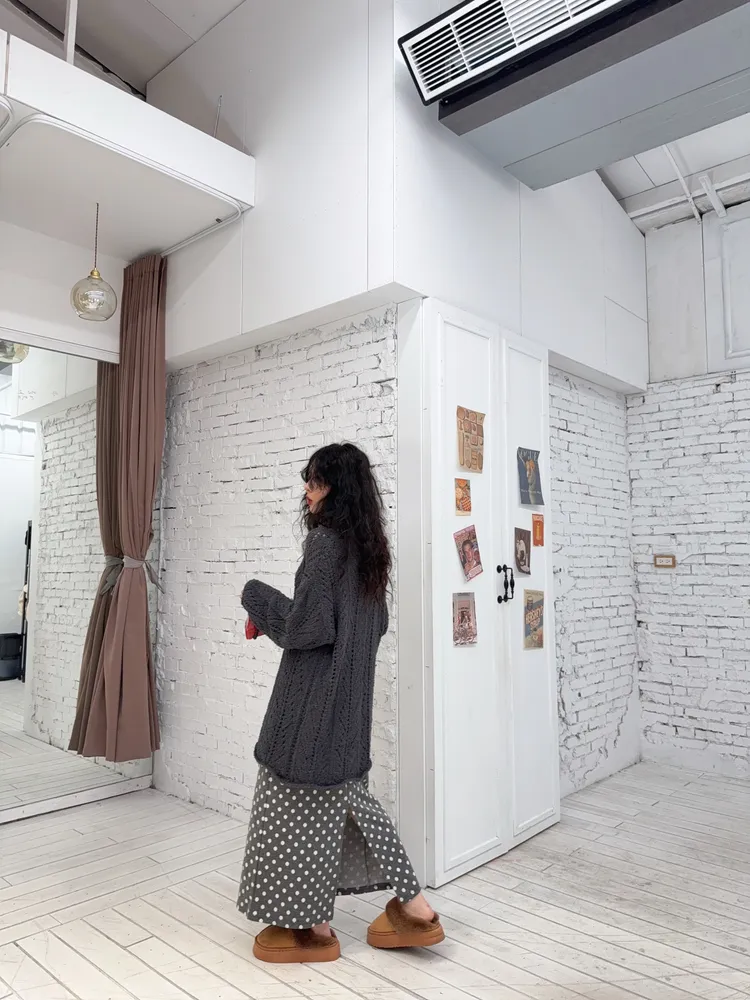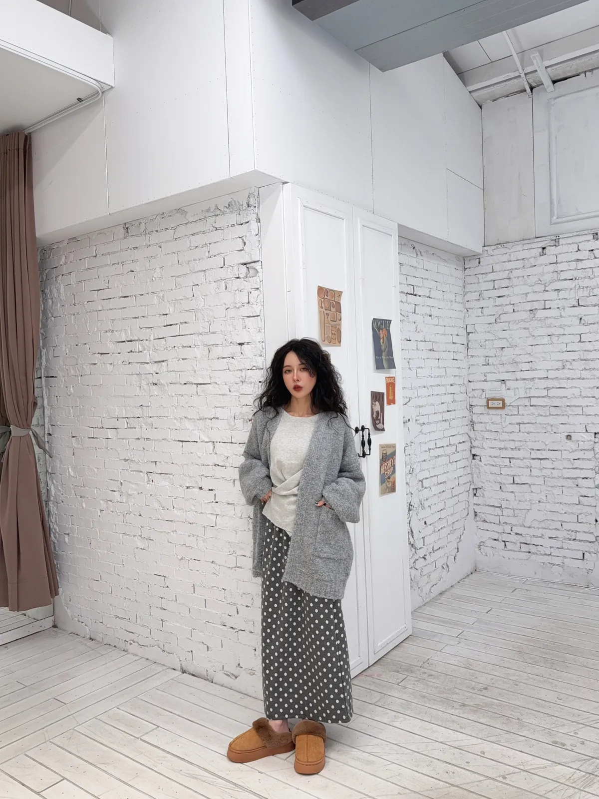 棉80% 聚酯纖維15% 彈性纖維5%毛料點點長裙 超讚的是面料本人有彈性不會真的穿上後動彈不得 是鉛筆裙的進化版 可以伸縮自如的鉛筆(笑)背後有開衩 所以走路起來更是便利這件毛料不是過度厚的材質 不會硬梆梆唷整件都是彈性裙頭如果你是棉花糖會怕毛料彈性你不一定可以進去可以等回台灣郭郭的直播 因為我現在也還沒看他穿過 我也沒把握