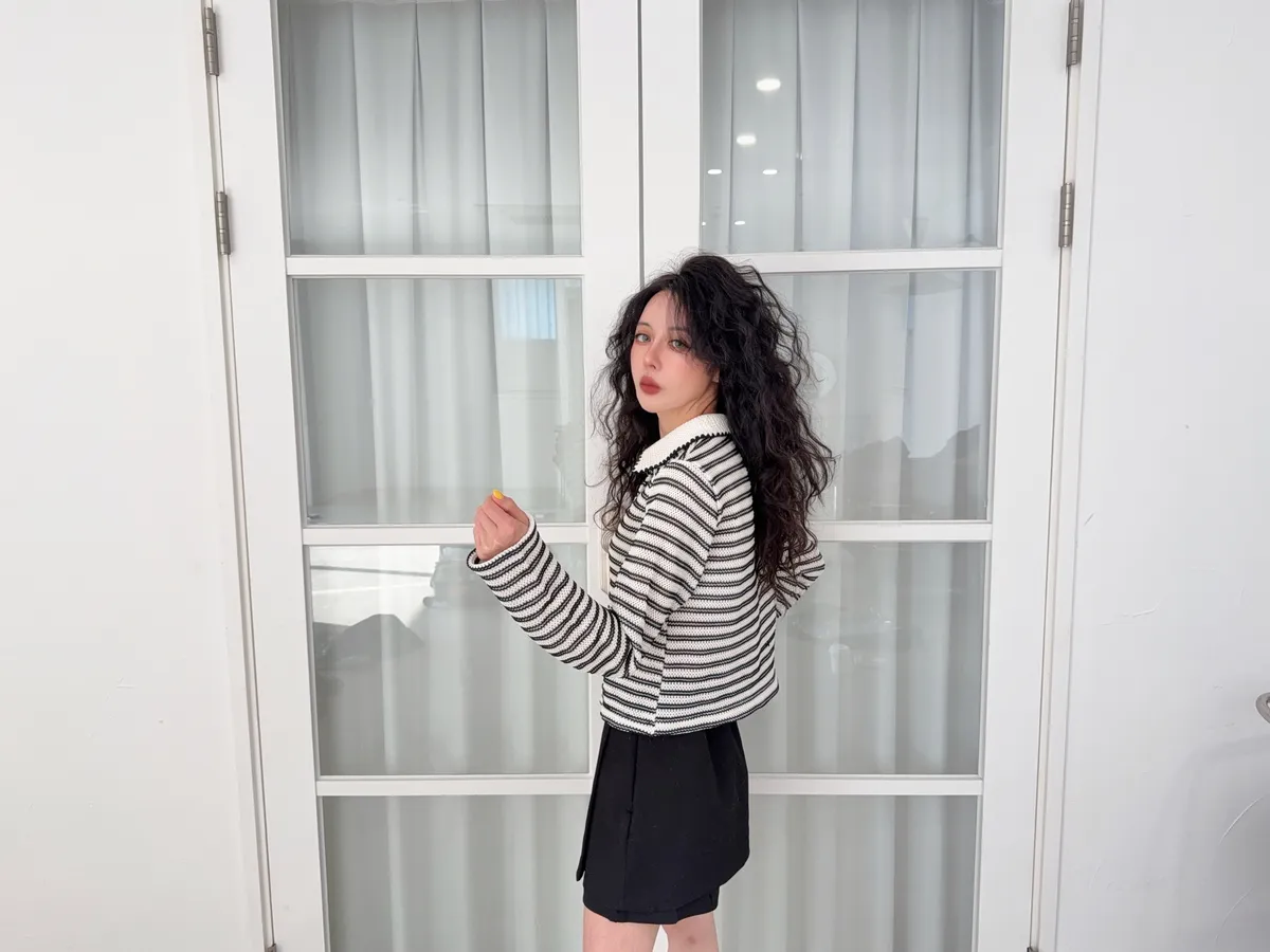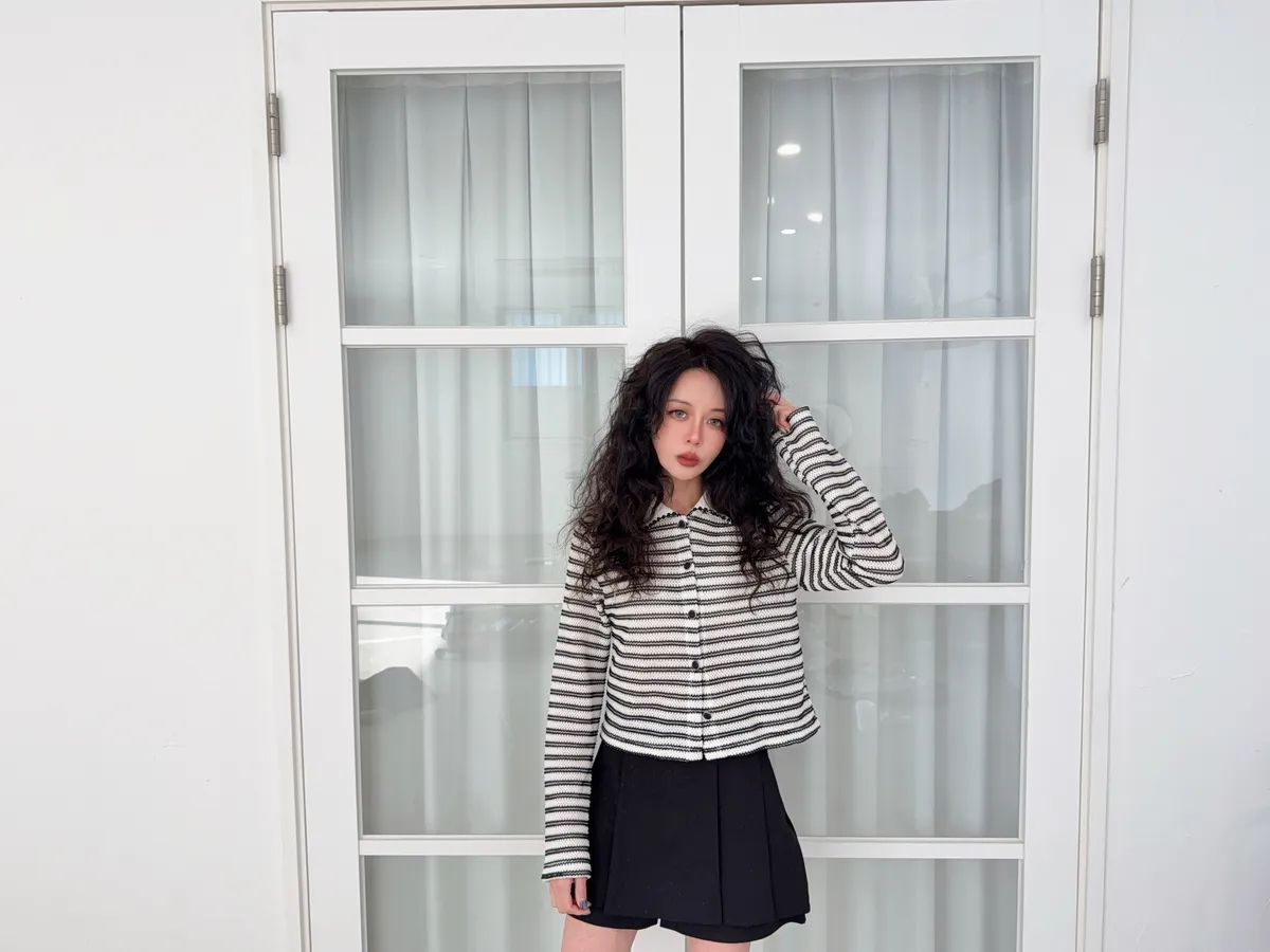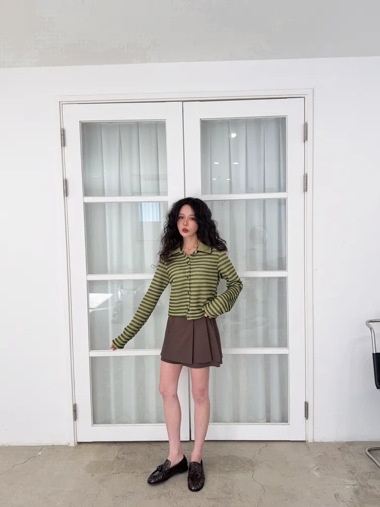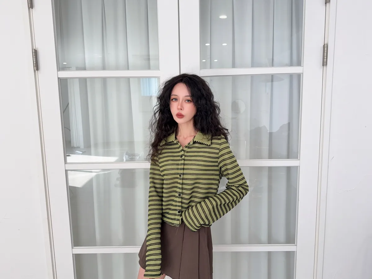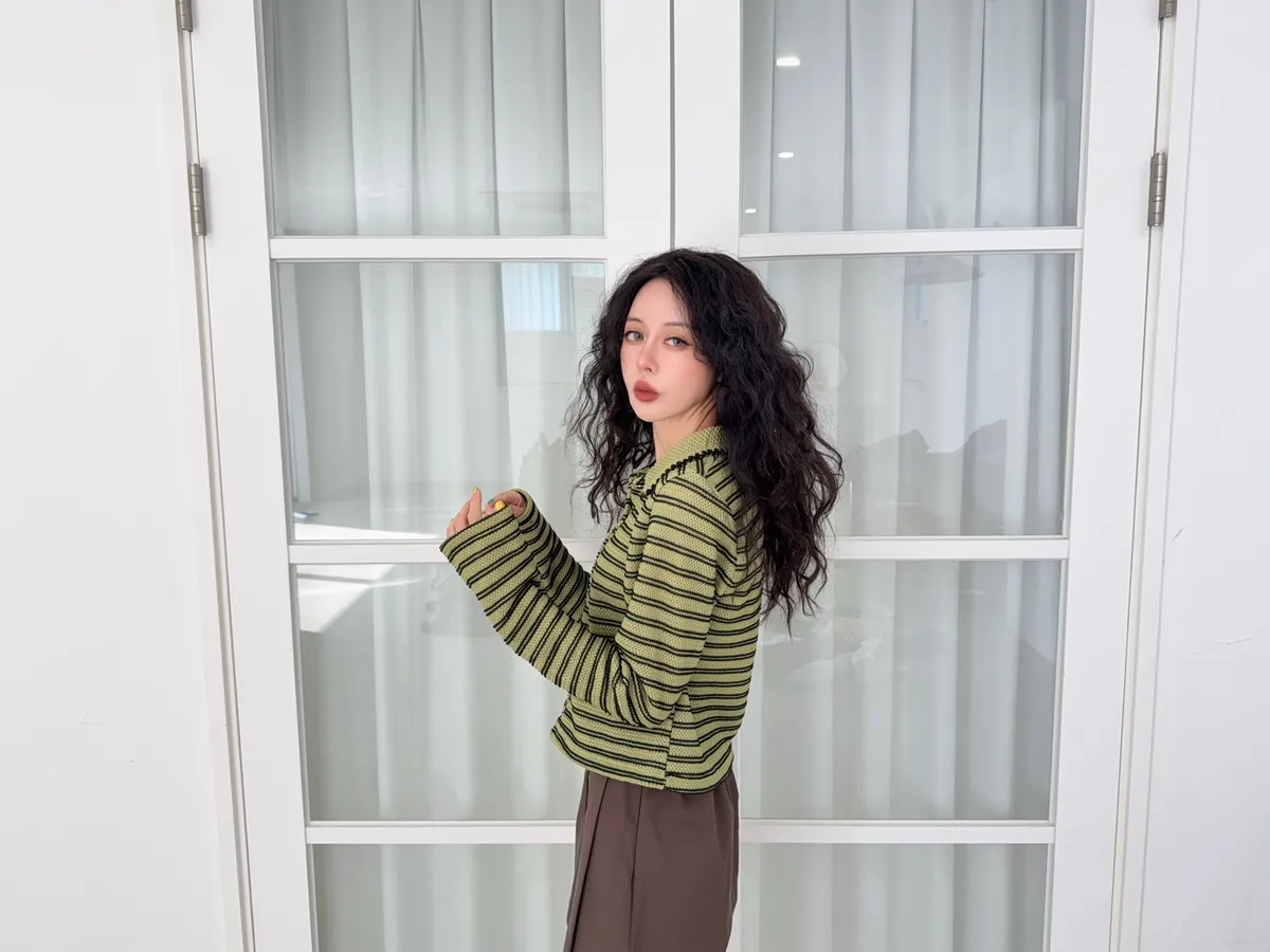 聚酯纖維80% 棉20%這件網網的針織混合太美了沒有帶任何明顯的雪花毛料感所以不會明顯第一眼就是冬裝 網網都是真的通風的唷沒有帶毛料所以輕盈感視覺可見重點是那個綠色太美了 好好看好神秘的綠色 很顯高雅寶石釦是最加分的 韓國的扣子都超美 我熱愛欣賞韓國各種美扣這件上衣不要用看起來以為很平凡的條紋洞洞他真的穿上意外非常非常修身