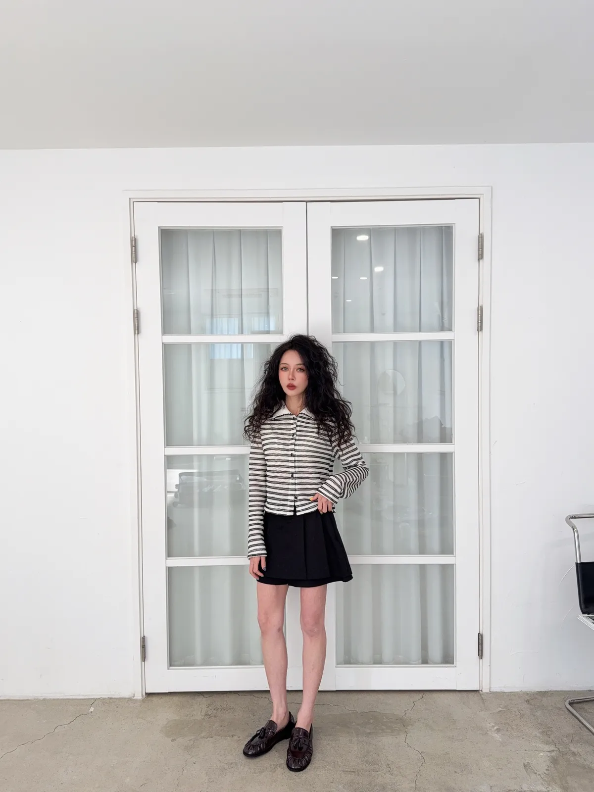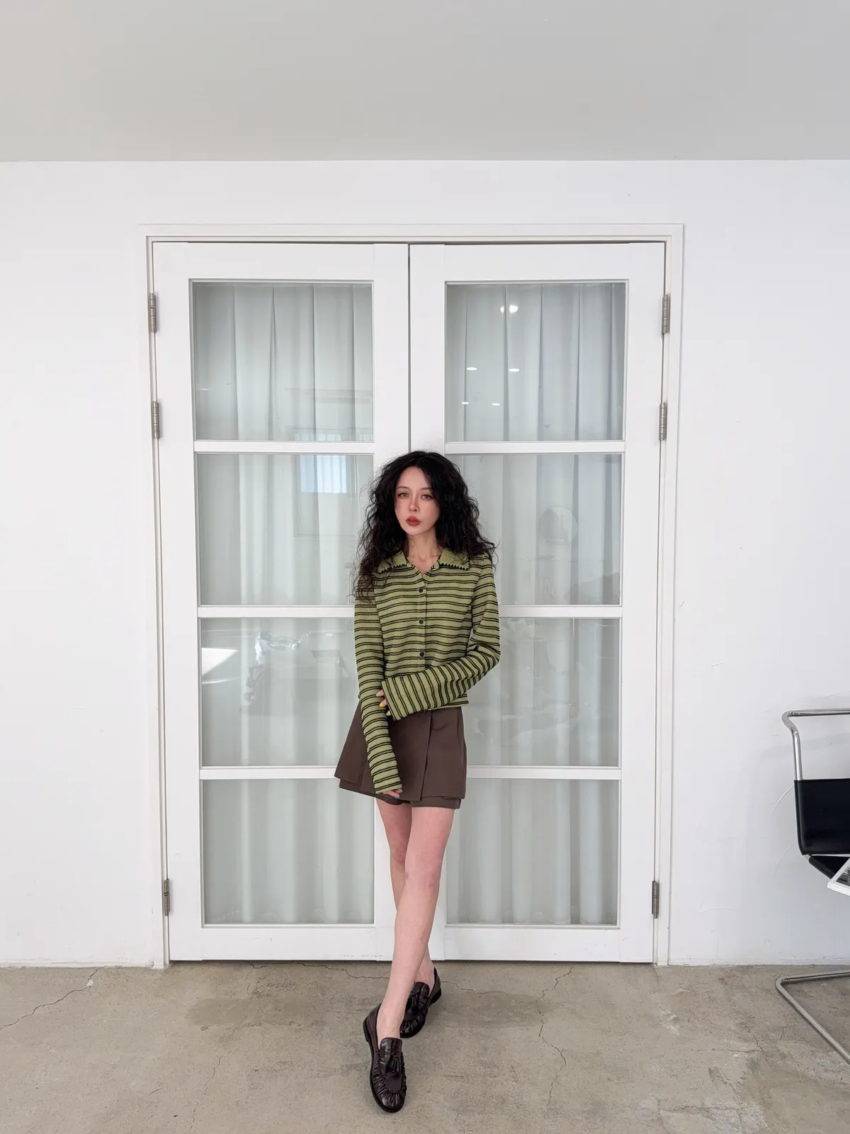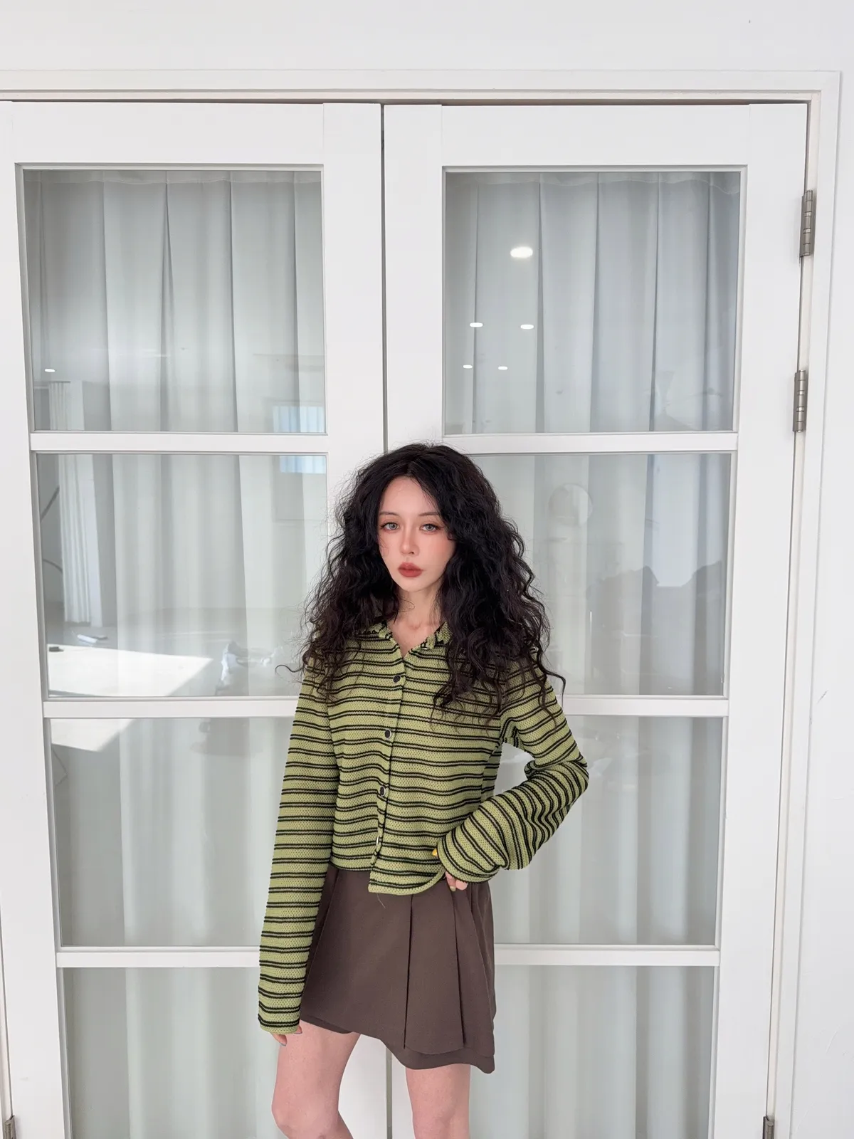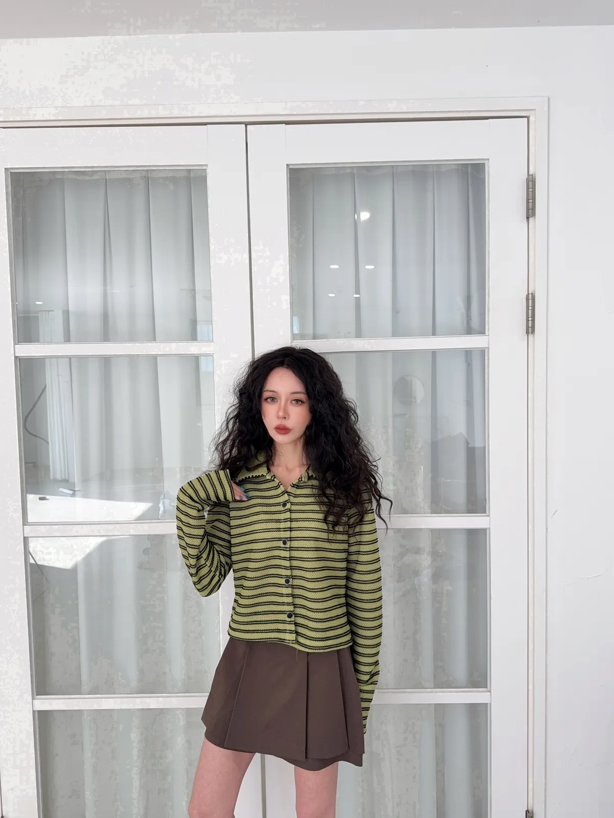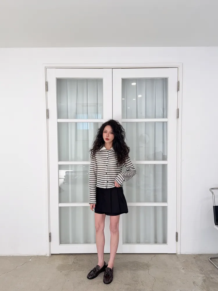 聚酯纖維80% 棉20%這件網網的針織混合太美了沒有帶任何明顯的雪花毛料感所以不會明顯第一眼就是冬裝 網網都是真的通風的唷沒有帶毛料所以輕盈感視覺可見重點是那個綠色太美了 好好看好神秘的綠色 很顯高雅寶石釦是最加分的 韓國的扣子都超美 我熱愛欣賞韓國各種美扣這件上衣不要用看起來以為很平凡的條紋洞洞他真的穿上意外非常非常修身