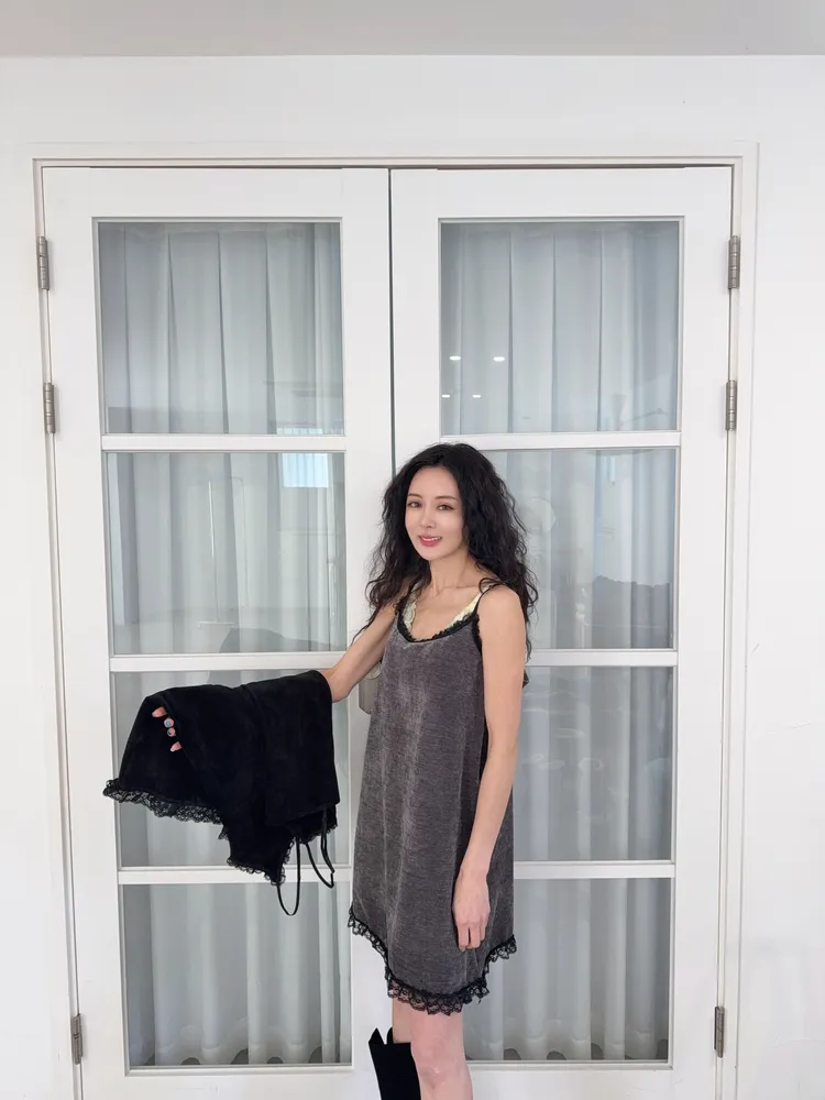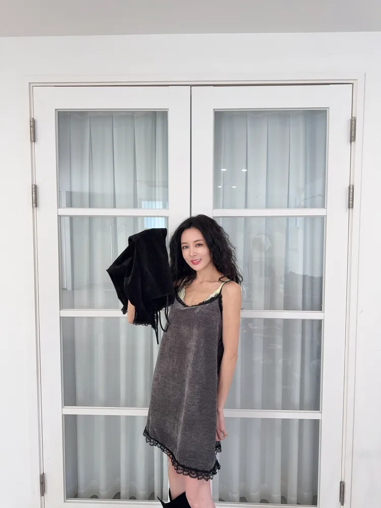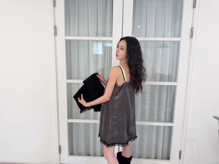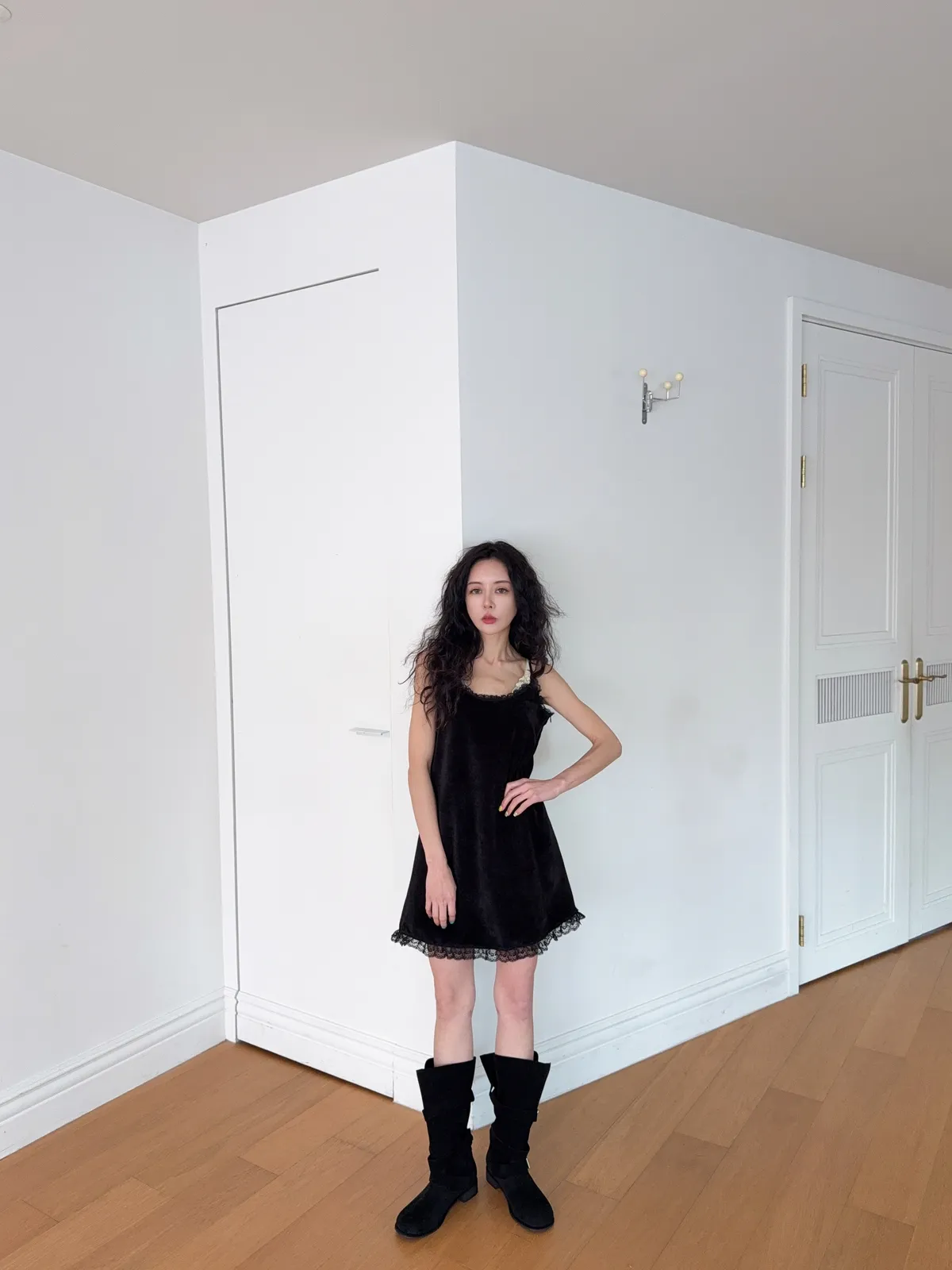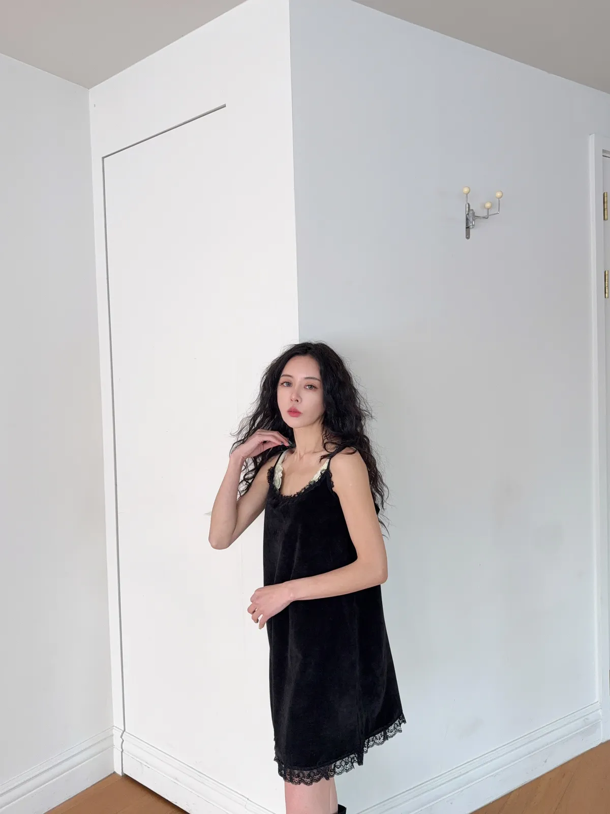 聚酯纖維96% 彈性纖維4%這款絨布超美霧面絨布的亮感就是各角度都能感受到他柔霧的光澤感這款肩帶可以調整 有調節扣可以單穿也可以像我搭配那樣配上短袖/或是薄長袖在裡面記得內搭的衣服不要落肩卡一坨布在腋下的都可以胸前跟下擺都有拼上蕾絲真的超美我好滿意這次的洋裝