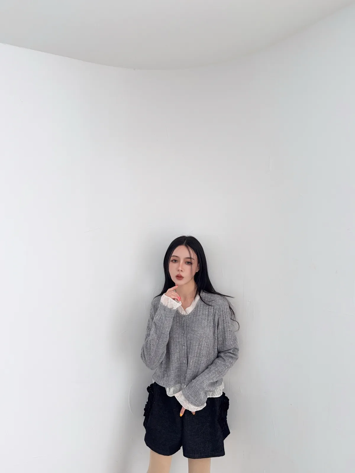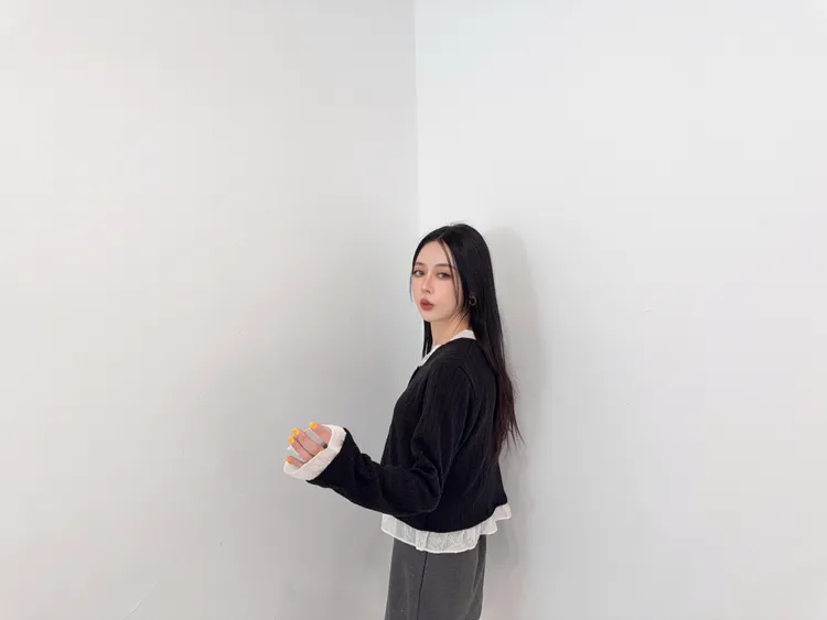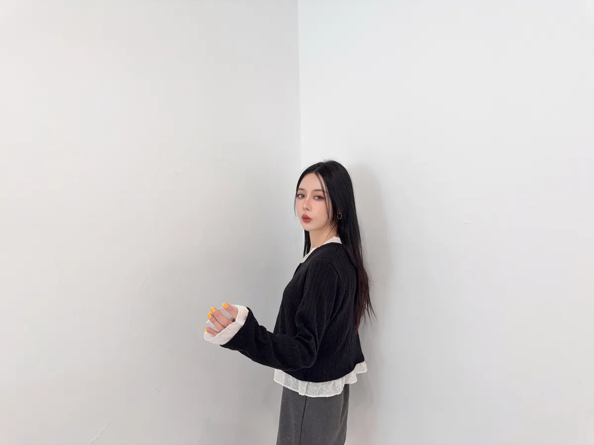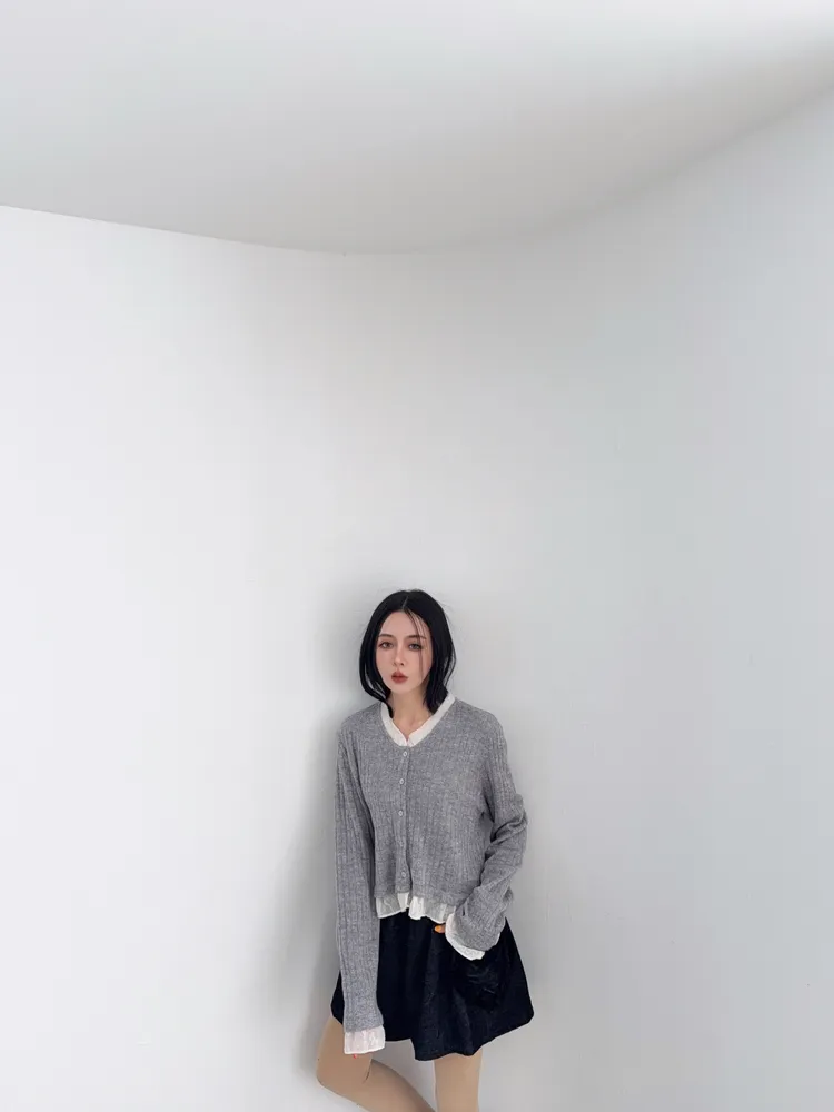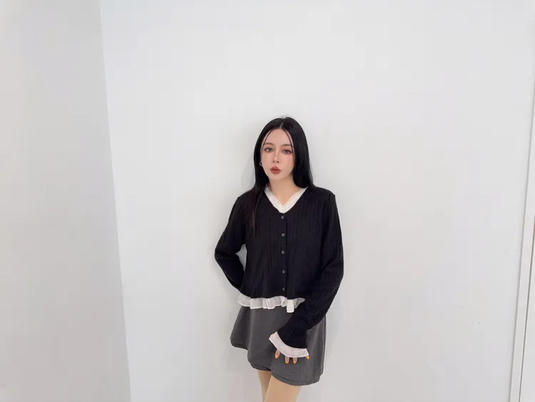 壓克力65%尼龍20%羊毛15%超喜歡這種薄軟針織 薄薄軟軟 很輕柔又輕盈真的是軟針織很修飾 不會貼死身體又很吃脂肪最喜歡手袖跟領口都有異材質拼接領口的有抽鬚 記得這種薄透針織 清洗的時候一定要洗衣袋 不要被其他的衣服勾傷了因為這款是真的薄軟針織的薄長袖概念哦好喜歡這種散擺拼接的設計 簡簡單單